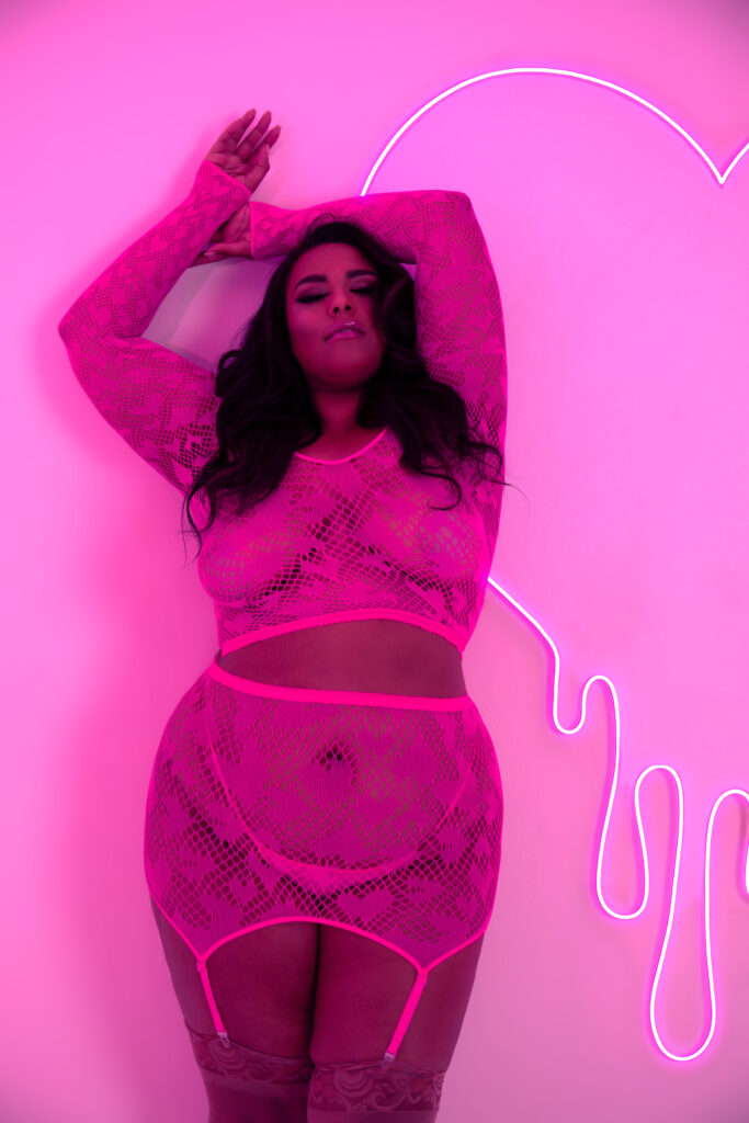 Send your lover’s heart into overdrive in this sexy plus size crop top set featuring sheer fishnet cups with embroidered hearts, off-the-shoulder long sleeves, and a matching garter skirt with adjustable garter straps.