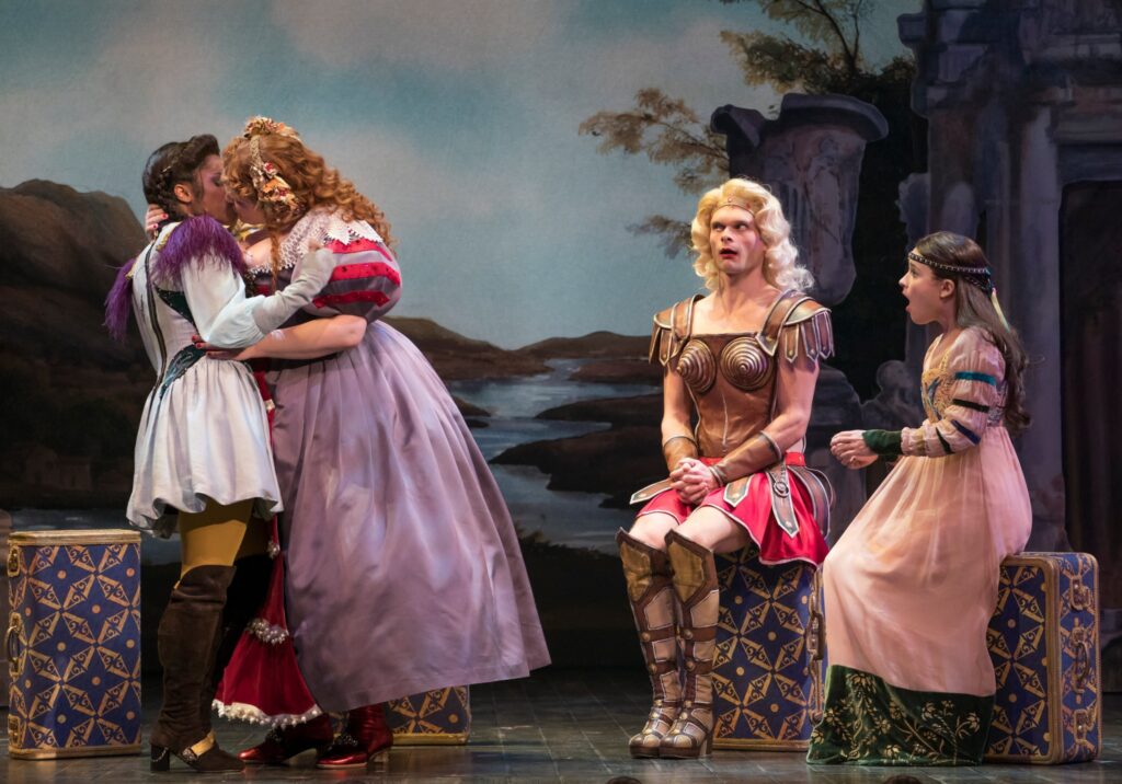 King Basilius (Jeremy Kushnier) of Arcadia is struggling with both of his daughter’s love lives. Pamela (Bonnie Milligan) refuses to choose a suitor because – though her father does not know – she is in love with her handmaid Mopsa (Taylor Iman Jones). Musidorus (Andrew Durand) starts dressing as a woman to be near his love Philoclea (Alexandra Socha), the king’s other daughter. Matters become worse when the oracle Pythio (Peppermint) warns of a bad future for the kingdom.