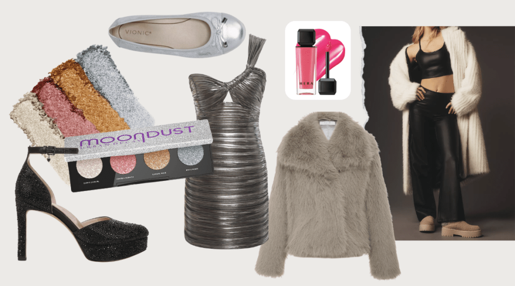 SHOP THE PHOTO: Urban Decay Moondust Glitter Eyeshadow Palette ($39) | Vionic Minna Ballet Flat ($119.95) | ASTR The Label Golda Metallic One Shoulder Dress ($138) | Naturalizer Rak Ankle Strap Dress Shoe ($325) | HERA Sensual Nude Gloss ($39.99) | Electric + Rose Mia Faux Leather Bra ($138) + Ella Faux Leather Pants ($158) | ASTR The Label Lynx Faux Fur Coat ($198)