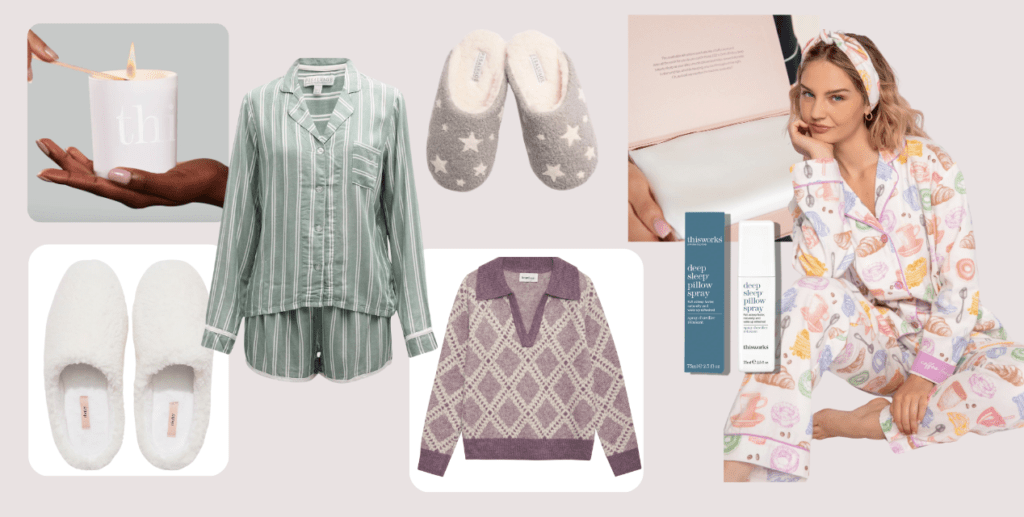 SHOP THE PHOTO: This Works Deep Sleep Heavenly Candle ($37) | Eberjey Sherpa Slipper ($62) | P.J. Salvage Stripe Hype Short PJ Set in Forest Green ($108) + Let’s Get Cozy Slippers ($46) | Heartloom Rita Sweater in Plum ($99) | Eberjey Inez Washable Silk Pillow Case | P.J. Salvage Flannels PJ Set ($72) | This Works Deep Sleep Pillow Spray ($30)