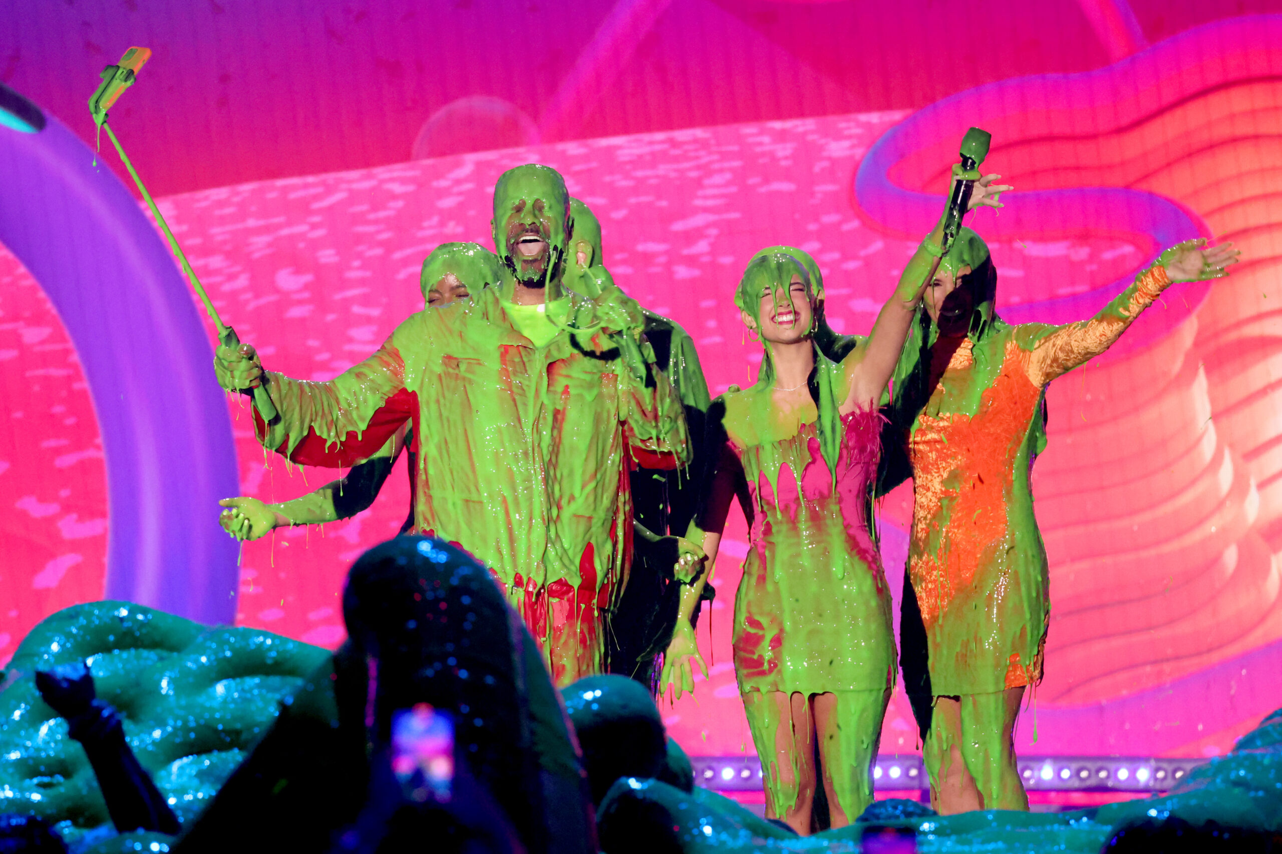 Nate Burleson and Charli D’Amelio, joined by their families on stage, for a grand finale sliming