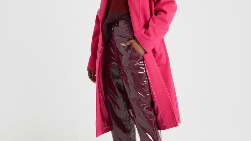 Longer A-line skirts feel light and lively in bright prints, styled back to oversized chunky knits. Flashes of metallic and studded embellishments add a touch of glam. Shearling-lined blanket coats, metallic motos and oversized bombers complete the look with a built-in attitude that is both fierce and feminine.