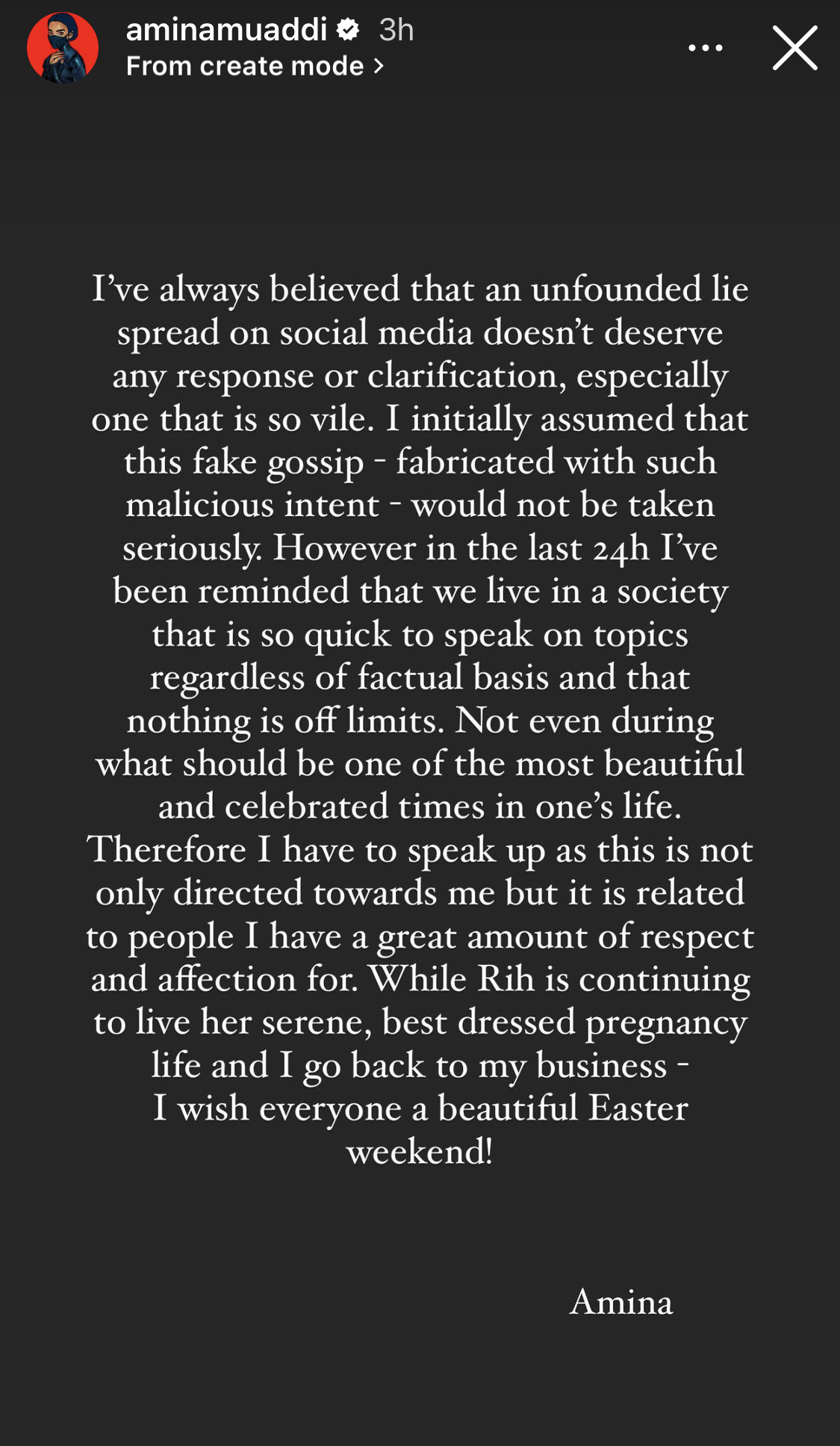 Muaddi also explained how she felt she had to say something about the lie because it was about her and “people I have great amount of respect and affection for.” She finished by mentioning Rihanna or Rih, as she calls her, is living her “best dressed pregnancy life.” Muaddi also added that she will go back to focusing on her business and wished everyone a “beautiful Easter weekend.”
