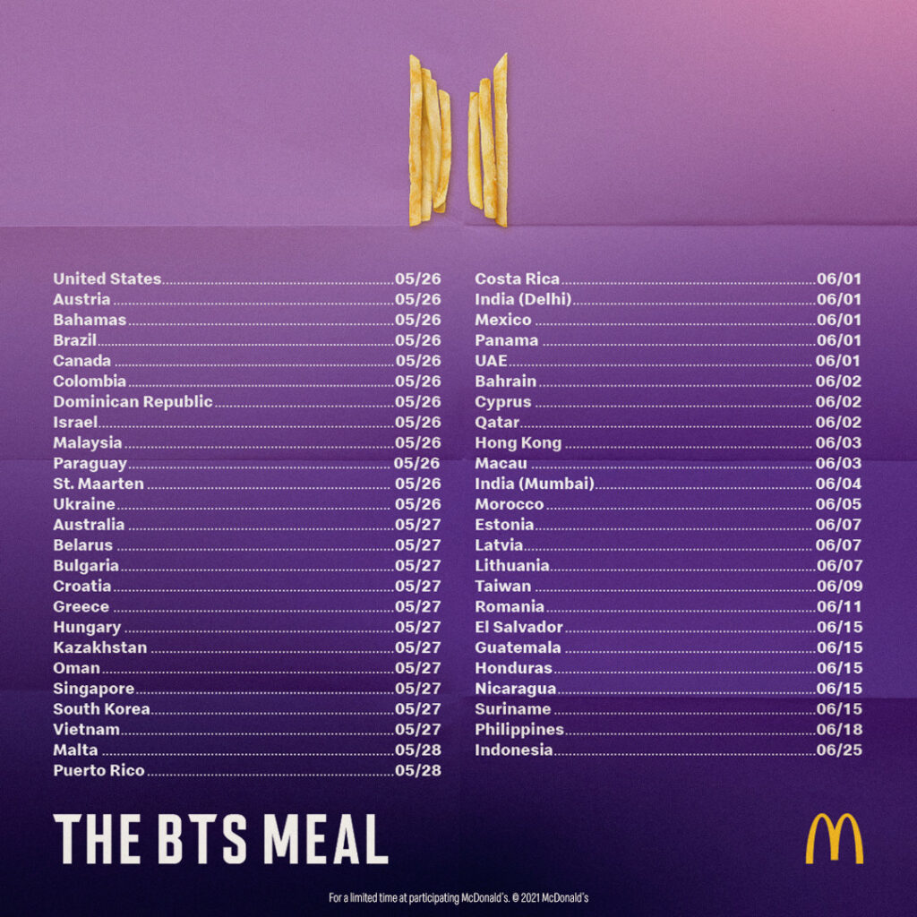 “The band has great memories with McDonald’s. We’re excited about this collaboration and can’t wait to share the BTS Meal with the world,” according to their record label Bright Music.