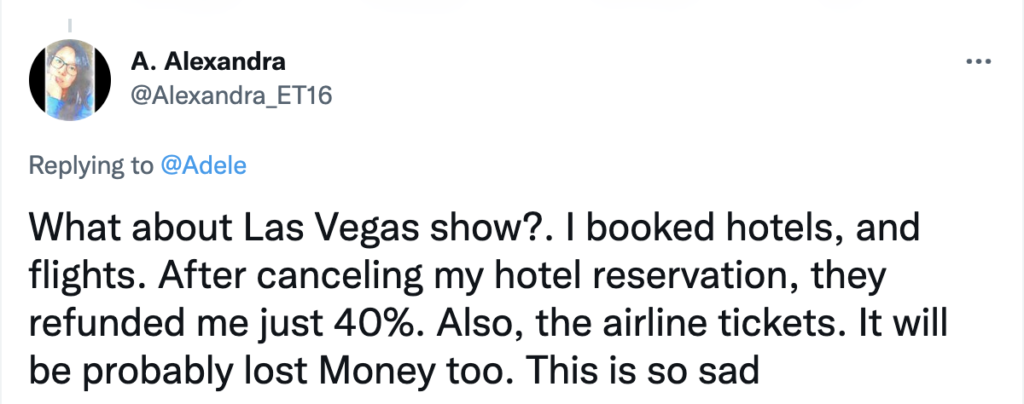 One fan wrote, “What about Las Vegas show?. I booked hotels, and flights. After canceling my hotel reservation, they refunded me just 40%. Also, the airline tickets. It will be probably lost Money too. This is so sad.”