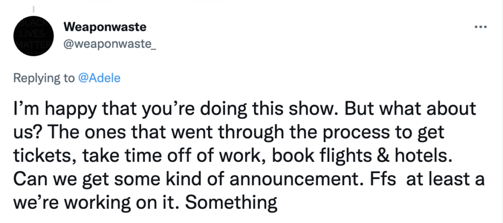 And another commented, “I’m happy that you’re doing this show. But what about us? The ones that went through the process to get tickets, take time off of work, book flights & hotels. Can we get some kind of announcement. Ffs at least a we’re working on it. Something.”