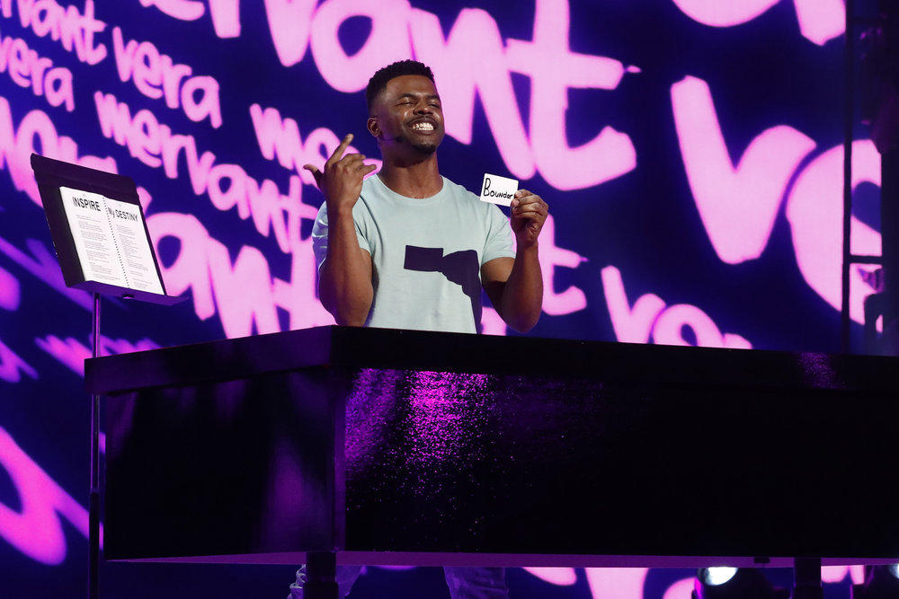 After shuffling to the page, Mervant reveals the title “Inspire,” and puts it on a music stand behind him for later on in the act. He takes out a handful of flashcards with a variety of different words, asking Terry to shuffle them up. Once returned to Mervant, he announces that he will be creating a freestyle rap with the words that Terry had just mixed up.