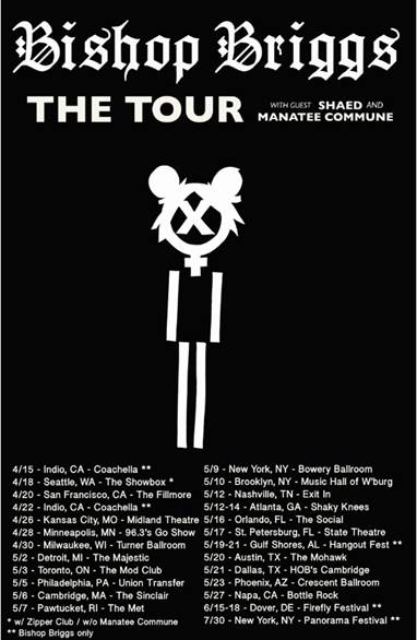 Over the first 10 days of the tour, Bishop will play the Coachella Festival on Saturday, April 15th, and Saturday, April 22nd. (Please see full tour itinerary below.) Tickets will be available for purchase starting Friday, February 3rd at 10am local time at http://bishopbriggs.com/tour.