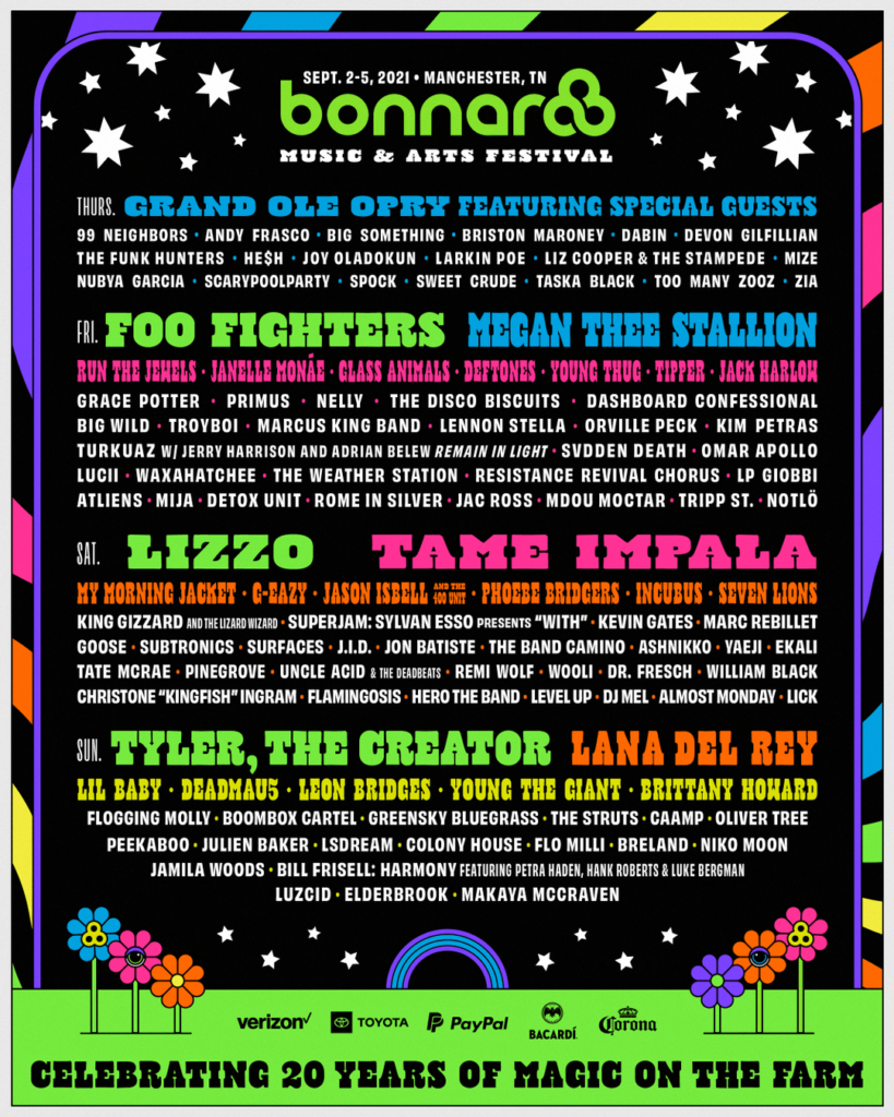 Bonnaroo is returning to Manchester, Tennessee from Sept. 2-5 later this year and the Grand Ole Opry will kick off the festival on Thursday, Sept. 2. Friday’s headliners include Megan Thee Stallion and Foo Fighters with Tame Impala and Lizzo leading Saturday and Tyler The Creator and Lana Del Rey headlining Sunday’s performance.