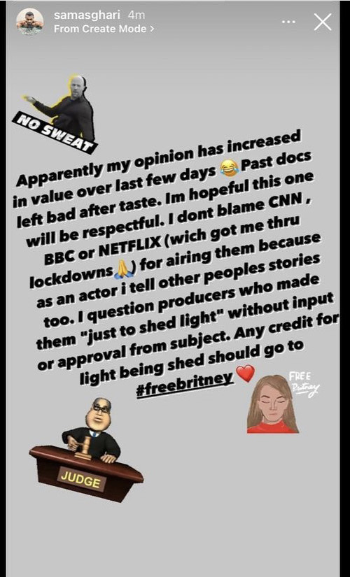 “Past docs left bad after taste. I’m hopeful this one will be respectful. I don’t blame CNN, BBC or Netflix for airing them because as an actor I tell other peoples stories too. I question producers who made them ‘just to shed light’ without input or approval from subject. Any credit for light being shed should go to #freebritney,” Asghari wrote on his Instagram Stories.