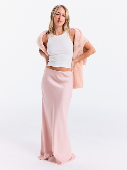 Who said blush tones are only for spring? Cider flips the script with creamy pistachios and dreamy pinks. Izzi’s satin skirt + cozy oversized knit combo is giving soft girl, but make it fall layering season.