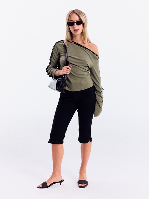 Utility, but fashion. Military jackets, tonal layering, and silhouettes that double as armor for the city grind. Izzi in an olive off-shoulder top + belted capris is the exact energy we want to channel for fall.