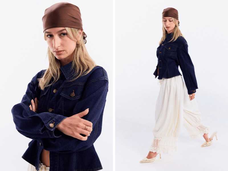 Romantic girls, this one’s for you. Lace, ruffles, and details that say, “yes, I do deserve to be the main character.” Izzi’s dark denim cinched jacket is basically Bridgerton-core goes downtown.