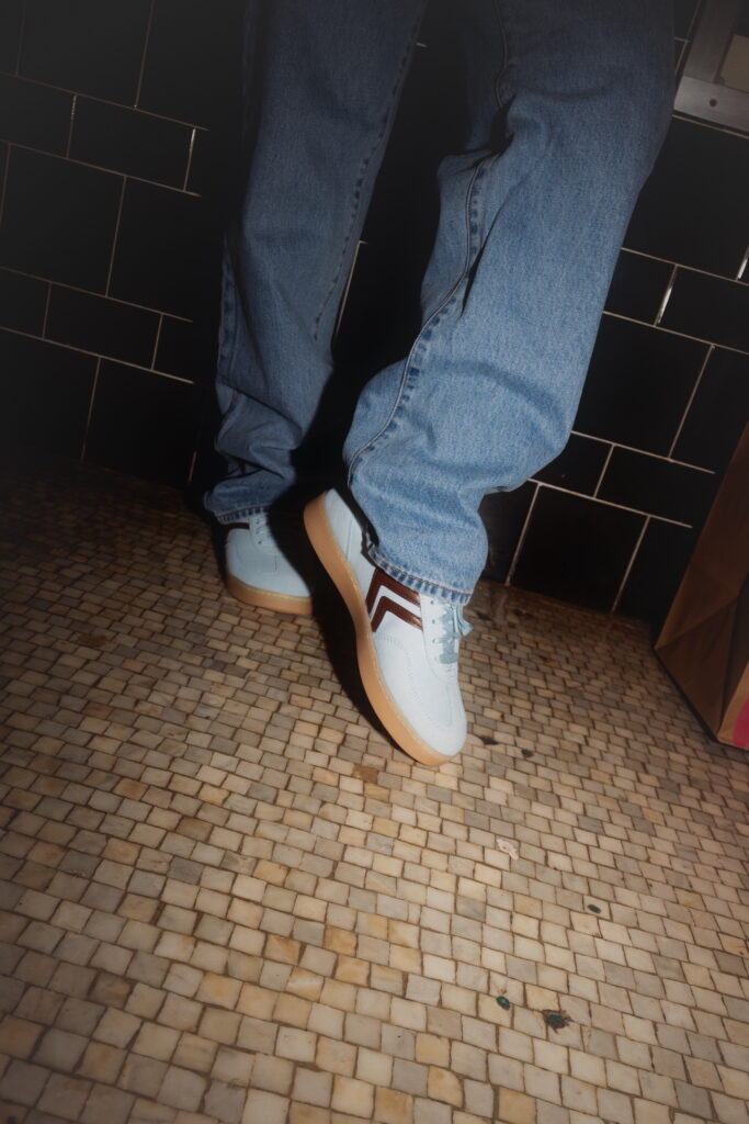 A classic black leather sneaker with cream-colored striping to resemble a cold glass of milk on a Saturday morning.