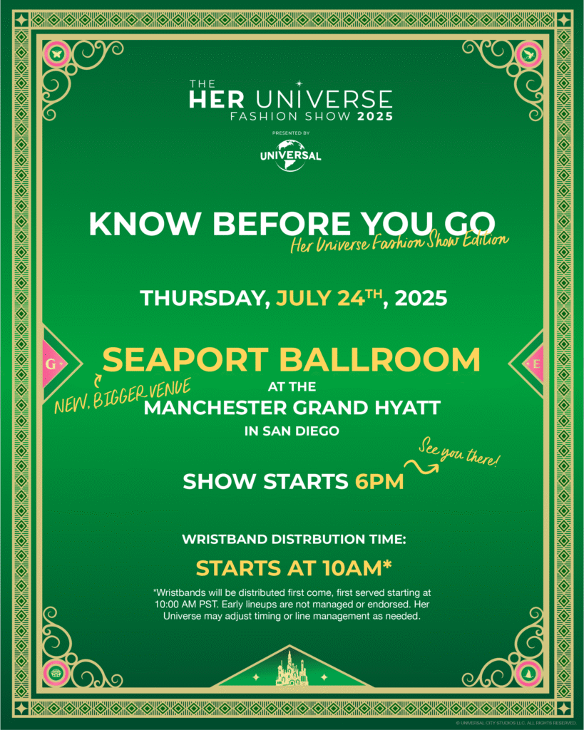You can catch the 2025 Her Universe Fashion Show at the Seaport Ballroom inside the Manchester Grand Hyatt San Diego on Thursday, July 24, 2025. Doors open at 5PM PT with the show starting 6PM PT. Wristbands are required and distributed first-come at 10AM PT at the venue. The HypeFriend! live taping after-party will take place on Friday, July 25 from 10–11AM at the San Diego Central Library. All of the deets can be found here.