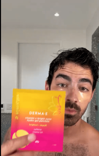 But instead of being weirded out, Joe did what any flawless-faced, fun-loving celeb with 6.6 million TikTok followers would do: he teamed up with clean beauty brand Derma E and slapped a pair of Vitamin C eye patches right on his chest. Yes, his chest.