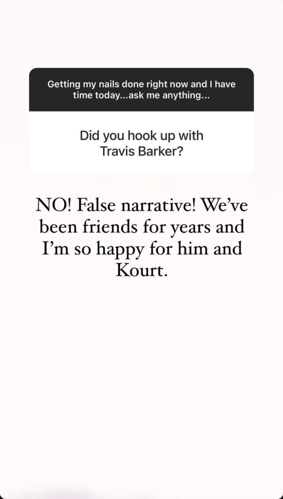 Yesterday (May 26), the reality star took to her Instagram story to do a fun little Q&A with her fans. One of her fans asked, “Did you hook up with Travis Barker?” To which she replied, “NO! False narrative! We’ve been friends for years and I’m so happy for him and Kourt.”