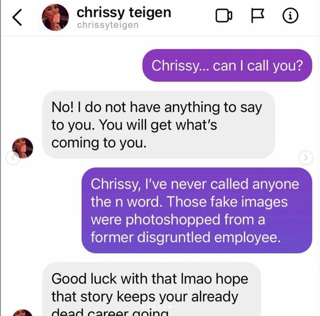 “Chrissy, I’ve never called anyone the n word. Those fake images were photoshopped from a former disgruntled employee,” he said. Teigen replied, “Good luck lmao hope that story keeps your already dead career going.”