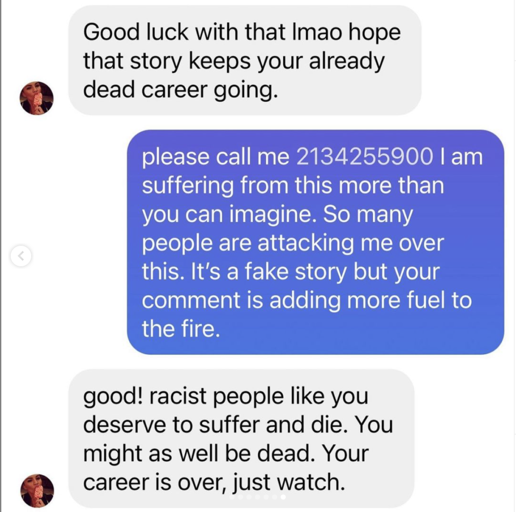 In the same Instagram post, Costello shared the screenshots of the conversation he had with Teigen, where she continues to cyberbully Costello by telling him to “suffer and die.”