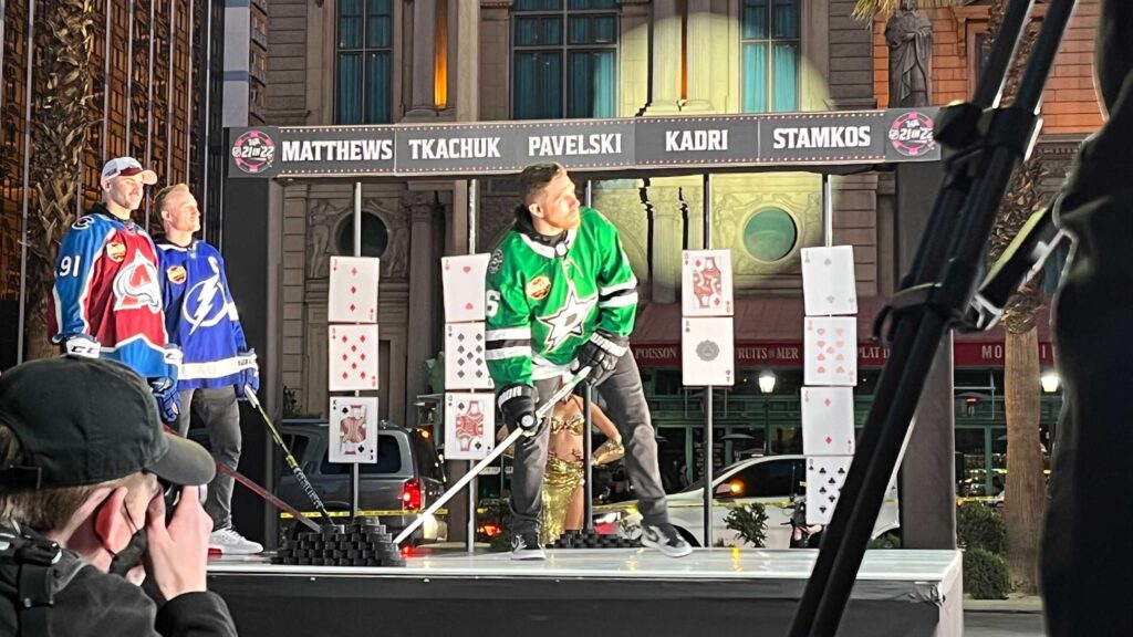 The NHL 21 in ’22 event was held on the Las Vegas Strip, and involved players playing a game of Blackjack. But rather than sitting at a table with a dealer, the players shot hockey pucks at oversized playing cards 35 feet away, attempting to hit the correct cards. Forward Joe Pavelski of the Dallas Stars won the contest by getting a queen of clubs, beating out Tampa Bay Lighting player Steven Stamkos and his four of clubs.
