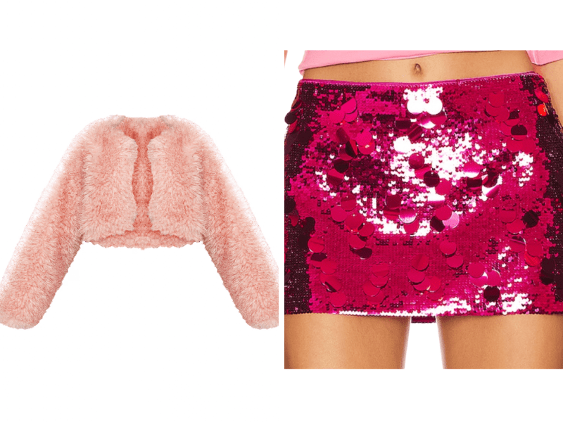 If you’re looking to recreate Paris’s show-stopping outfit, you can snag the Light Pink Ombre Faux Fur Coat from PrettyLittleThing for $46 here to stay warm while serving major winter glam. You’ll obv have to pair it with GUIZIO‘s Low Rise Pailette Mini Skirt in Fatale Pink for $168 here to add that eye-catching sparkle.