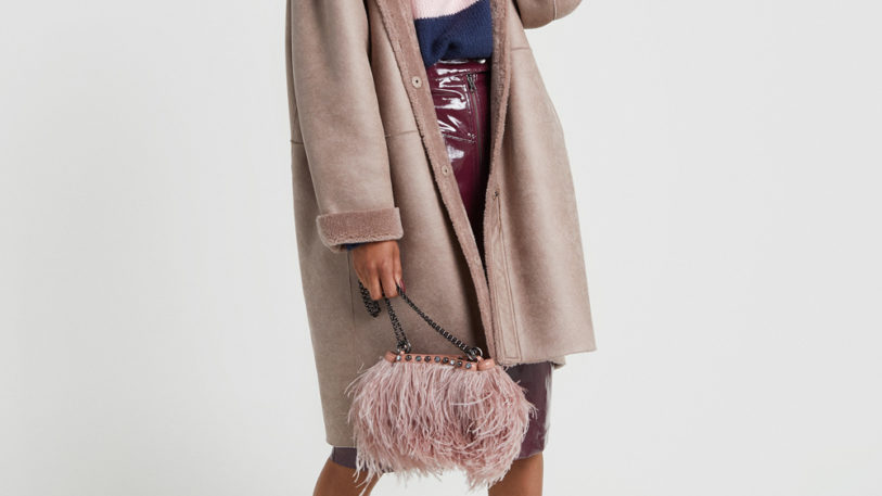 Longer A-line skirts feel light and lively in bright prints, styled back to oversized chunky knits. Flashes of metallic and studded embellishments add a touch of glam. Shearling-lined blanket coats, metallic motos and oversized bombers complete the look with a built-in attitude that is both fierce and feminine.