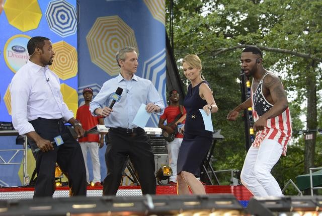 GOOD MORNING AMERICA – Jason Derulo tries to teach the team to dance during his concert in Central Park as part of the GMA Summer Concert Series, on GOOD MORNING AMERICA, 7/4/14, airing on the ABC Television Network. (ABC/Ida Mae Astute) RYAN SMITH, DAN ABRAMS, AMY ROBACH, JASON DERULO