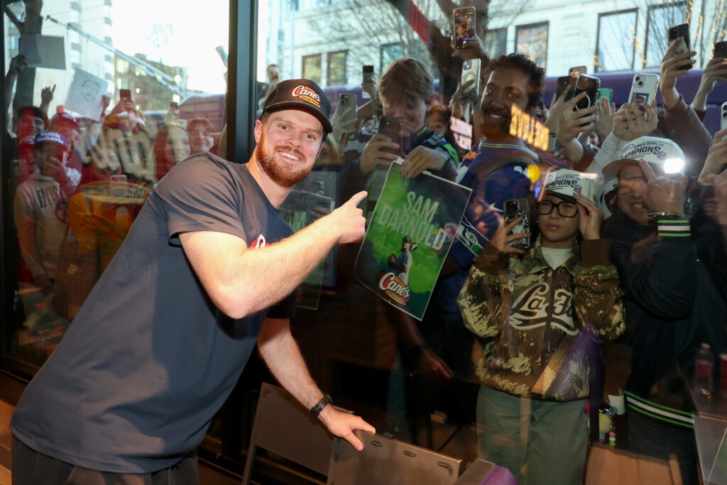 Before the restaurant officially opens its doors on February 17, Raising Cane’s founder Todd Graves welcomed Darnold inside for a fan-filled celebration that felt less like a brand activation and more like a full-circle moment. More than 1,000 fans packed the Emerald City storefront, chanting “HAWKS! HAWKS!” as their quarterback stepped behind the counter to serve Chicken Fingers, bag Box Combos and thank the city that stood behind him all season.