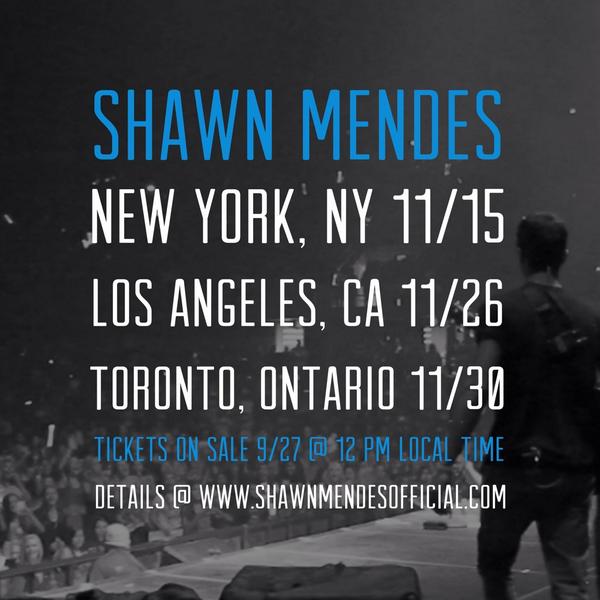 Shawn Mendes, the Vine star turned pop star whose debut EP hit #1 on iTunes this past summer, has announced his first headlining dates in three major cities! Shawn has previously opened shows for acts like Fifth Harmony and Austin Mahone, and fans have been dying to see more of him. Not only will Shawn be playing new music at these dates, but the first fifty fans to buy tickets for each show will get a meet and greet with him!