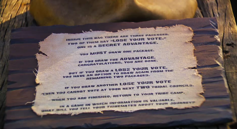 Upon arriving at the unknown location, the three castaways split up to play an individual game. The instructions read, “Inside this bag there are three packages. Two of them say ‘lose your vote.’ One is a secret advantage. You must draw one package. If you draw the advantage, congratulations, you are done. But if you draw a ‘lose your vote,’ you have an option to draw again from the remaining two packages. If you draw another ‘lose your vote,’ then you cannot vote at your next two tribal councils.”