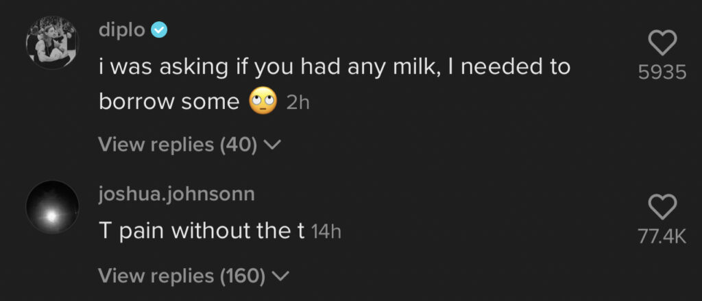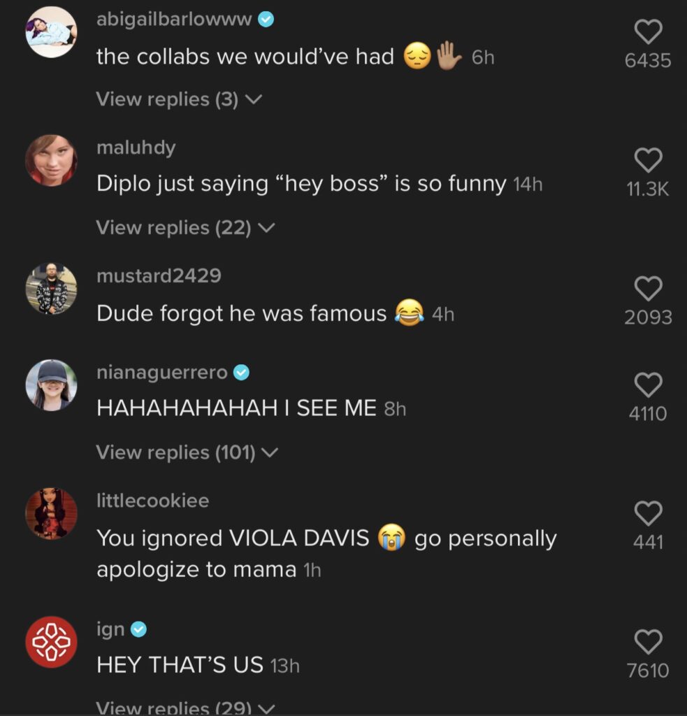 Maybe start by buying them a drank? Diplo, who was one of the celebs seen in his requests, commented on the video, saying, “I was asking if you had any milk, I needed to borrow some 🙄.” Tyler Cameron and IGN also commented on identifying themselves on the list of ignored messages and let him know that there were no hard feelings.
