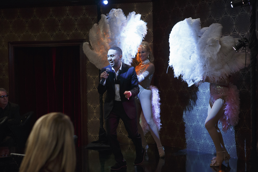 BABY DADDY – “What Happens In Vegas” – Riley is not thrilled when Bonnie promotes her to Maid of Honor and demands a crazy bachelorette party, while Brad (Peter Porte) asks Danny to be his best man and throw an epic, yet dignified, bachelor party. Tucker tells everyone he’s going to a television convention in Detroit, but he’s actually making his annual trek to Vegas, where he spends one weekend a year living his dream of being a lounge singer. When the boys discover where Tucker really is, they decide to move Brad’s bachelor party to the desert, which, of course, means Bonnie and Riley right on their heels. When they accidentally discover Tucker’s act, everyone agrees to enjoy their own nights, but things get very interesting when Bonnie ends up handcuffed to illusionist Peter Oliver (Dan Castellaneta). Meanwhile, Danny finally admits to Ben that he’s in love with Riley, on an all-new episode of “Baby Daddy,” airing Wednesday, July 29th, 2015 at 8:30PM ET/PT on ABC Family. (ABC Family/Bruce Birmelin)