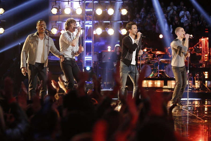 THE VOICE — “Live Show” Episode 715B — Pictured: (l-r) Damien Lawson, Matt McAndrew, Adam Levine, Chris Jamison — (Photo by: Trae Patton/NBC)