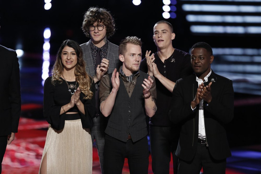 THE VOICE — “Live Show” Episode 713A — Pictured: (l-r) Mia Pfirrman, Matt McAndrew, Taylor Phelan, Chris Jamison, Damien Lawson — (Photo by: Tyler Golden/NBC)