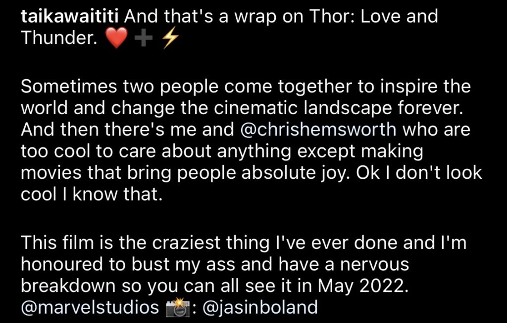 He said, “And that’s a wrap on Thor: Love and Thunder. ❤️➕⚡️ Sometimes two people come together to inspire the world and change the cinematic landscape forever. And then there’s me and @chrishemsworth who are too cool to care about anything except making movies that bring people absolute joy. Ok I don’t look cool I know that. This film is the craziest thing I’ve ever done and I’m honoured to bust my ass and have a nervous breakdown so you can all see it in May 2022. @marvelstudios 📸: @jasinboland”