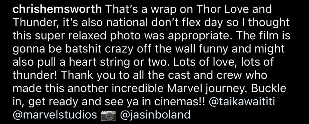 His caption reads, “That’s a wrap on Thor Love and Thunder, it’s also national don’t flex day so I thought this super relaxed photo was appropriate. The film is gonna be batshit crazy off the wall funny and might also pull a heart string or two. Lots of love, lots of thunder! Thank you to all the cast and crew who made this another incredible Marvel journey. Buckle in, get ready and see ya in cinemas!! @taikawaititi @marvelstudios 📷 @jasinboland”