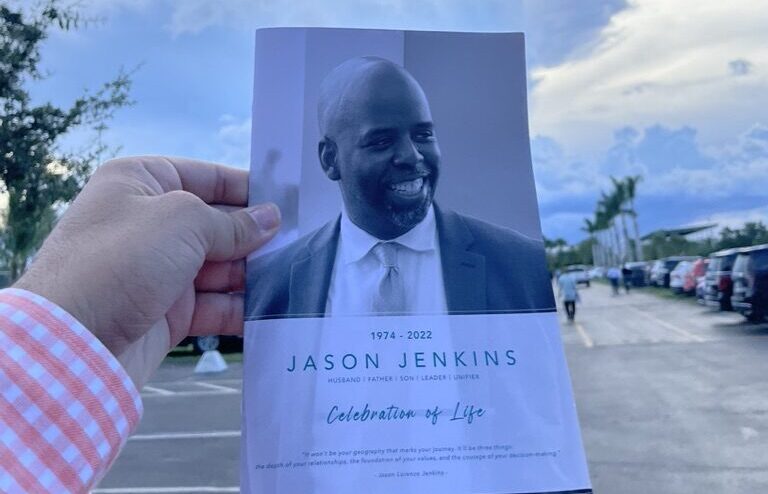 During this celebration of Jason, seven people spoke wonderfully. I want to shoutout each one of them, Coastal Community Church Lead Pastor TJ McCormick, President & CEO of the Urban League of Broward County, Dr. Germaine Smith Baugh, North Miami Police Chief, Larry Juriga, Lennar Corporation Board of Directors, and Dolphins Challenge Cancer Executive Chairman, Stuart Miller, Antioch Missionary Baptist Church Pastor, Arthur Jackson III, Miami Dolphins, and Hard Rock Stadium Vice Chairman, President, & CEO, Tom Garfinkel, and lastly, the incredible wife of Jason Jenkins, Elizabeth Jenkins. She did such a beautiful job honoring her late husband.