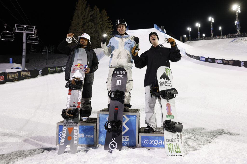 Zeb Powell, Liam Brearley, and Darcy Sharpe at the podium during Thayers Men’s Snowboard Knuckle Huck at 2024 X Games Aspen at Buttermilk in Aspen, CO. ©Trevor Brown, Jr./X Games